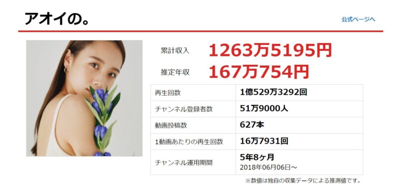 まず、YouTubeチャンネル「アオイの。」の推定年収がこちらです。