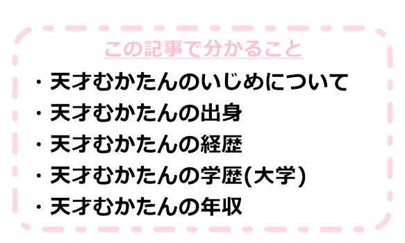 そんな天才むかたんさんのいじめについてや出身などプロフィール、経歴、学歴、年収について調べていきました。
