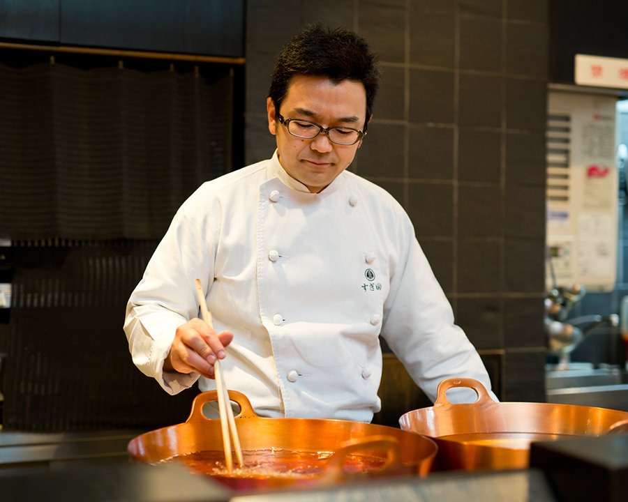 油は最初の頃からオランダのラードを溶かして使い、2つの鍋を使って、温度を変えて揚げています。